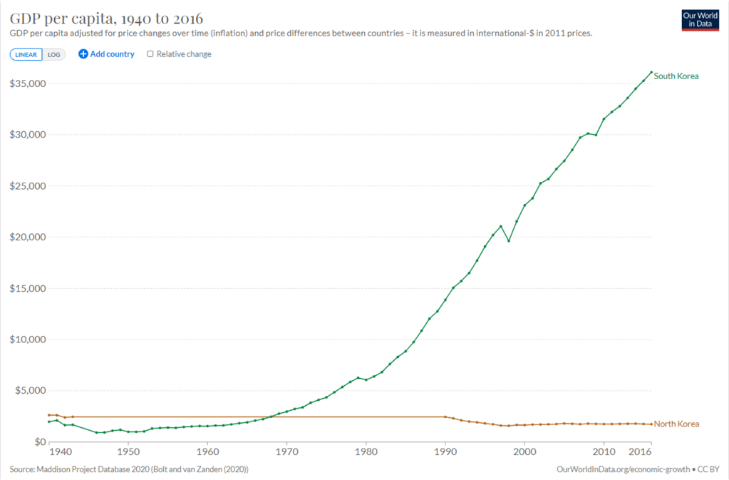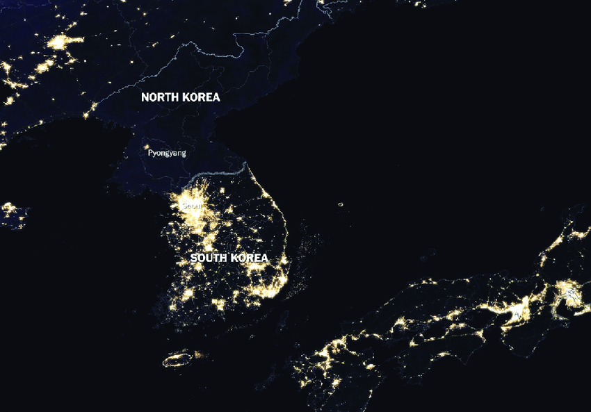 South Korea saw an exponential rise in growth and living standards whereas North Korea has declined. Under the economic and political dictatorship of the Kim family, North Korea has subjected its citizens to eternal misery and hardship with no end in sight. In fact, without the Soviet Union and China, North Korea would be in an even worse predicament than is the case currently. From the 1980s onwards, North Korea has used its natural resources to exchange for electricity and food. Yet as the Kim regime has failed to put this to productive use, North Korea has continued on the path to misery. Witnessing the two nations at night from space says it all.