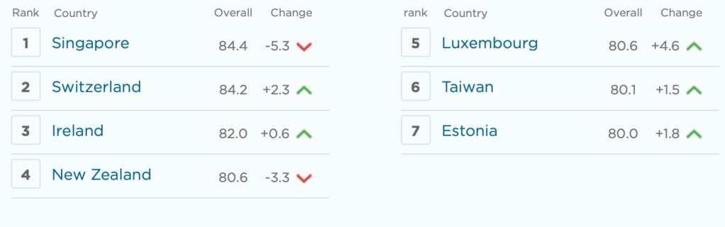 A clear correlation exists between the economic liberalism of a nation and its prosperity. Economic freedom is defined by how little state intervention there is in the economy; policies such as low taxes, limited regulations, and liberalised trade borders constitute a free economy. According to the index of Economic Freedom in 2022, Singapore and Switzerland ranked 1st and 2nd respectively; similarly, both nations rank in the top 5 for GDP per capita in the world.